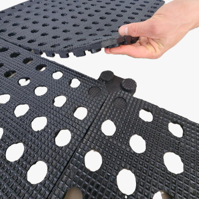 Aplicación: Ideal para cubrir superficies en entornos industriales y comerciales. Su diseño modular entrega una superficie antideslizante y cómoda, perfecta para zonas de trabajo que requieren seguridad, protección y confort.